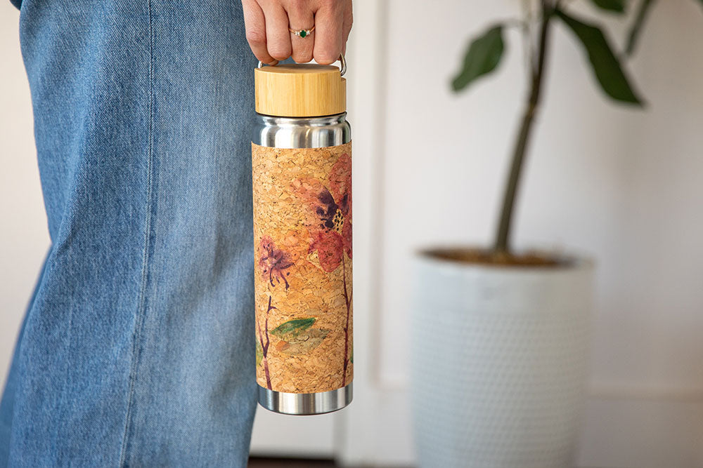 Extra durable double-walled stainless steel means your bottle won't "sweat". Natural cork exterior is easy to grip on the go.