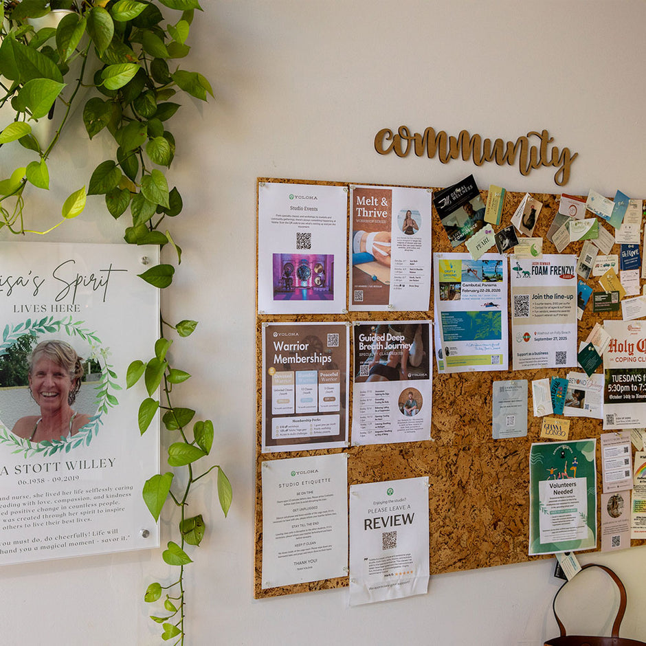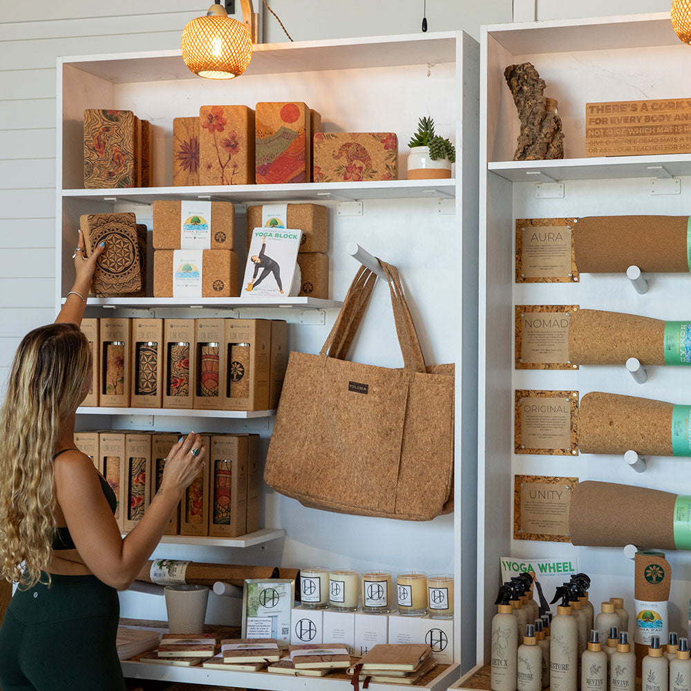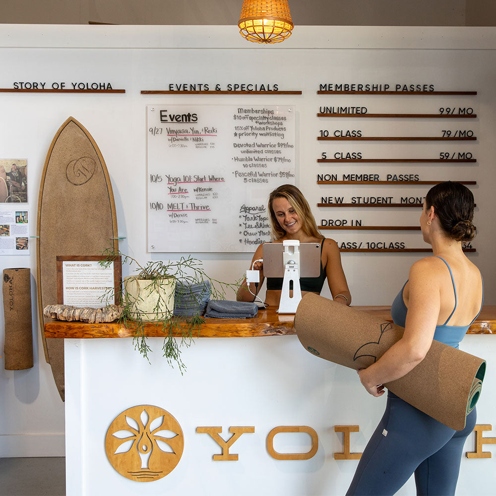 - Cork yoga mats, blocks, bolsters, and blankets are FREE to use!