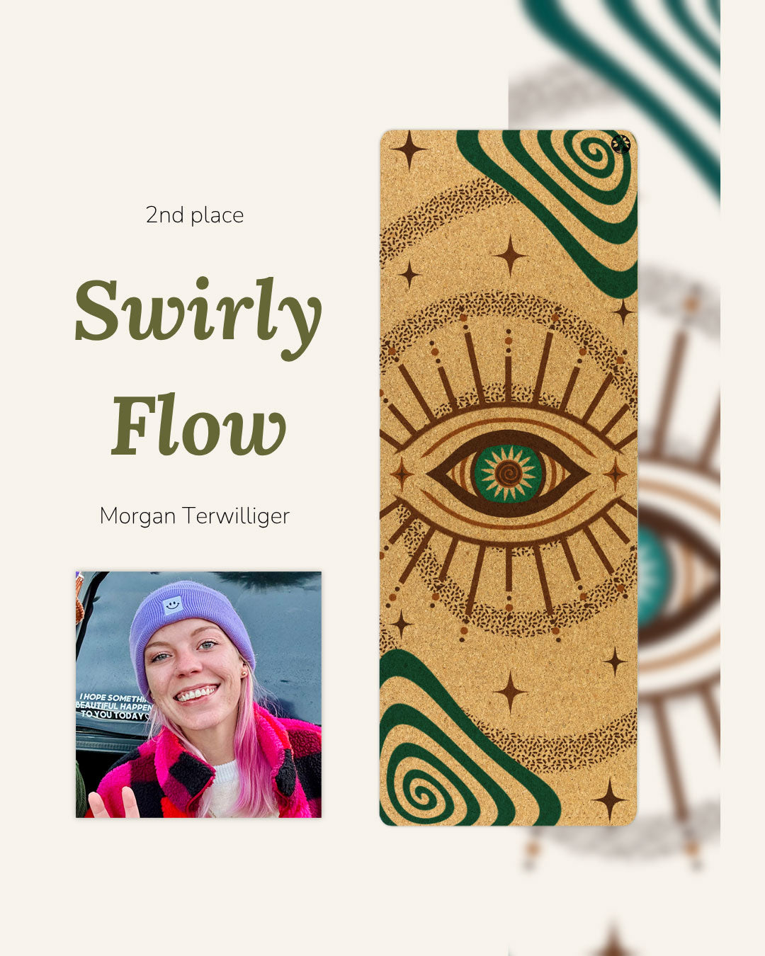 Swirly Flow was inspired by the seamless flow of yoga poses, with each one swirling into the next. The eye is representative of the awakening of perspectives gained from practicing.