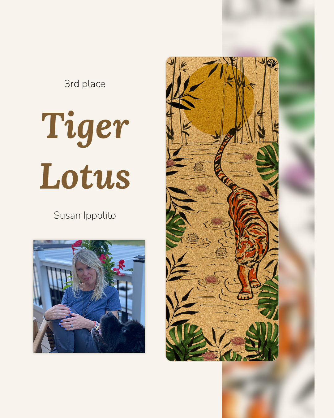 A symbol of strength and serenity, the tiger moves with purpose through water, while the lotus blooms in stillness.  This design embodies the balance between power and peace, intention and clarity, reflecting the harmony of nature's quiet wisdom and our resilience awakened through the practice of yoga.