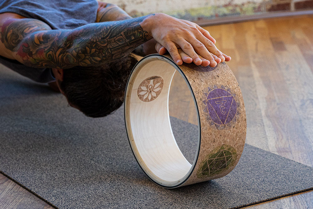 A simple circle with a surprising amount of ways to enhance your practice. Yoga wheels are an excellent tool for stretching, relieving pain in the spine and shoulders, and assisting the safe advancement into deeper postures. Our handmade wheels are constructed from sustainably-sourced maple and poplar wood. Rounded interior edges make gripping comfortable. An outer layer of foam topped with cork provides added support with cork's non-slip benefits.